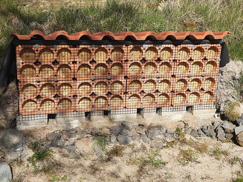 Aus diesem Grund ist bei größeren oder stark besiedelten Nistwänden ein zusätzlicher Schutz sinnvoll. Bewährt hat sich ein Schutzgitter aus sogenanntem Volierendraht mit einer quadratischen Maschengröße von etwa 19 mm, möglichst schwarz kunststoffummantelt. Drahtgitter mit dieser Maschengröße behindern die Wildbienen kaum, halten Vögel jedoch zuverlässig fern.