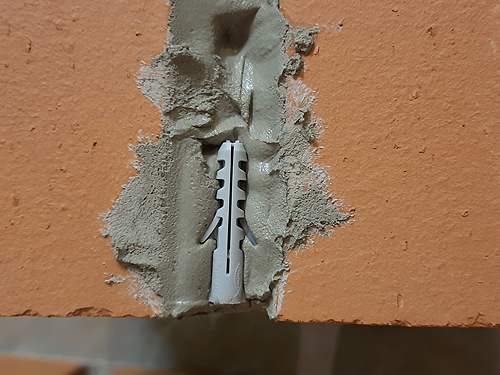 In die seitlichen Aussparungen der Weinlagersteine werden dazu Dübel (8 × 40 mm) mit Fliesenkleber eingeklebt. Anschließend sollte auch die noch freiliegende Seite der Dübel mit etwas Fliesenkleber überzogen werden, sodass sie vollständig eingebettet sind. Dabei ist zu beachten, dass der Fliesenkleber mehrere Tage zum vollständigen Durchhärten benötigt. Wird er vorher belastet, kann der Kleber brechen und die Befestigung sich lösen.