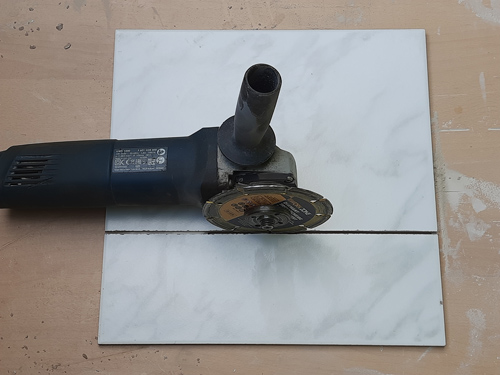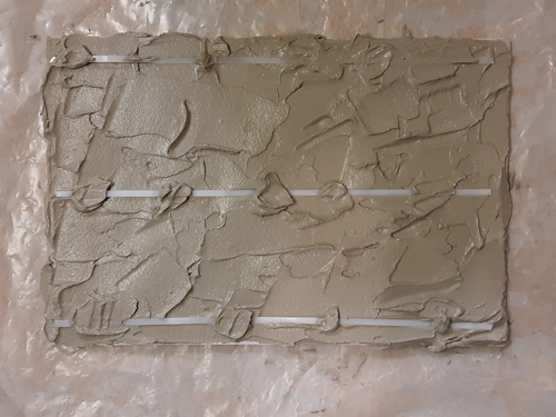 Anschließend wird die Fliese mit Fliesenkleber bestrichen und der noch leere Weinlagerstein daraufgestellt. Damit der Fliesenkleber durch das Gewicht des Steins nicht vollständig weggedrückt wird, können zuvor Fliesenkreuze oder – wie auf dem Bild gezeigt – zugeschnittene Kabelbinder als Abstandshalter eingelegt werden.