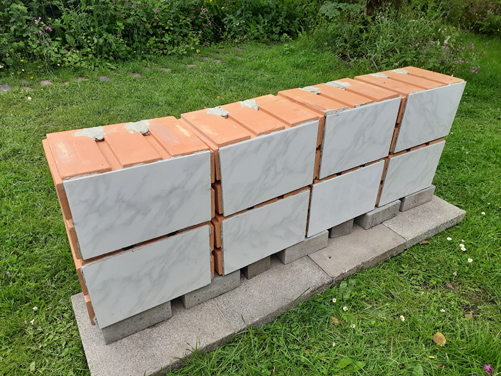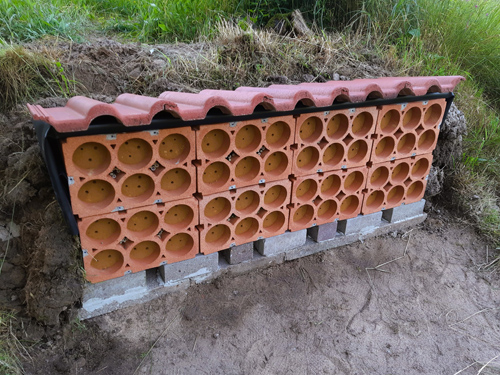 Weinlagersteine sind auf beiden Seiten offen. Wenn die Steilwand ungeschützt im Freiland aufgestellt werden soll oder als Stützmauer – beispielsweise für ein Hochbeet-Sandarium – dient, empfiehlt es sich, eine Seite der Steine zu verschließen, etwa mit aufgeklebten Fliesen.