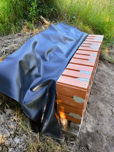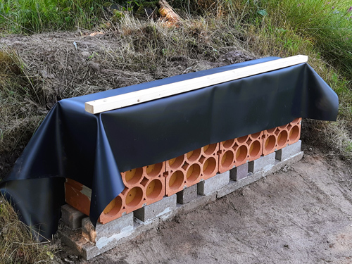 Soll die Nistwand im Freiland als Stützmauer verwendet werden – etwa als künstliche Abbruchkante oder Steilwand – empfiehlt es sich, die Konstruktion zusätzlich vor eindringender Feuchtigkeit zu schützen. Dazu kann die Nistwand an der Oberseite sowie an der Rückseite, gegebenenfalls auch an den Seiten, mit Gartenteichfolie abgedeckt werden.